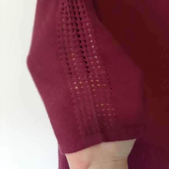 This beautiful dark raspberry colored lightweight sweater features a boatneck, open weave at the bottom hem and along the arms and 3/4 sleeves. Boxy shape. No tags to indicate brand or fabric content. Very slight pilling from use. Good used condition. From a smoke free home.