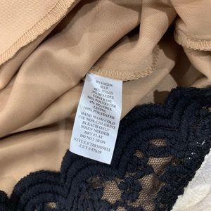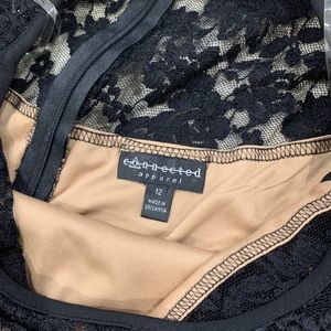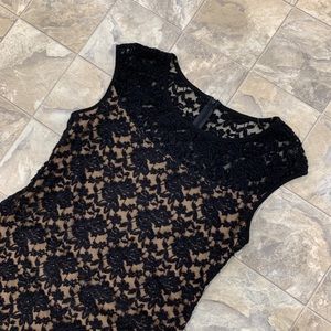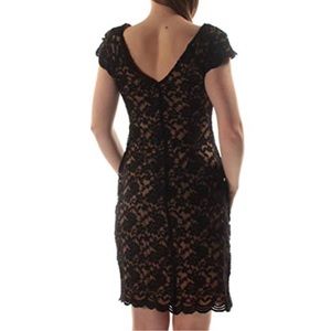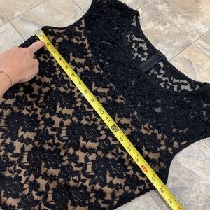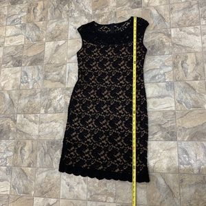 CONNECTED APPAREL All Over Lace Cocktail Dress | Black floral lace over contrast tan nude lining | form fitting bodycon silhouette | cap sleeves | scalloped bottom hem | illusion neckline | flattering V back | hidden back zip closure | 95% nylon, 5% spandex | size 12 | length across chest is 18” | inseam is 30” | length from shoulders to bottom hem is 39”