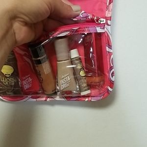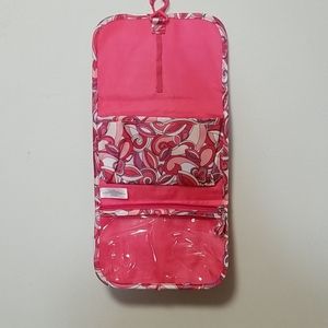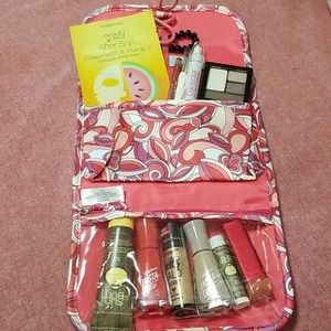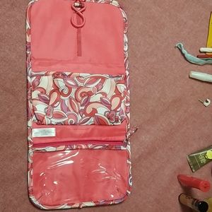 A beutiful colorful makeup caddy. Open but never used. Is very convenient for travel. To organize your makeup. If you think outside the box you can also use it to keep yours jewelry in place when going on vacation. It become like an envelope if you close as showing in the pictures. It multitask. 🛍🌺💙