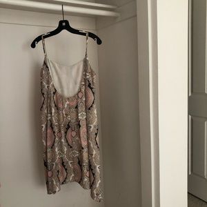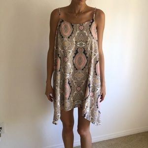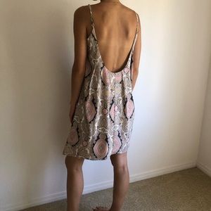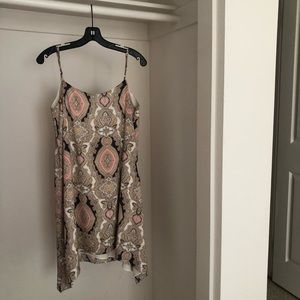 Beautiful gold, blue and pink printed dress with a low scoop back and longer on the sides.