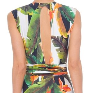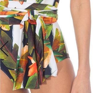 Swimsuit featuring a neckline cut down to there a keyhole back and swingy sash that cinches the look of a tropical vibes.