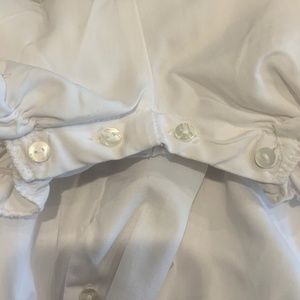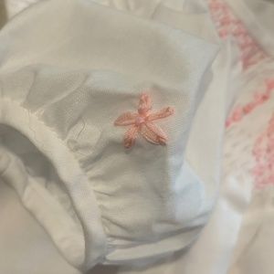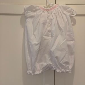 Darling girls white bubble, puff sleeve romper with carnation pink smocked embroidery is a modern classic. Button closure at seat.