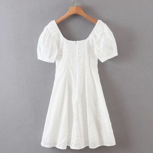 Laced up puff sleeve short dress eyelet crochet lace floral dot white off the shoulder