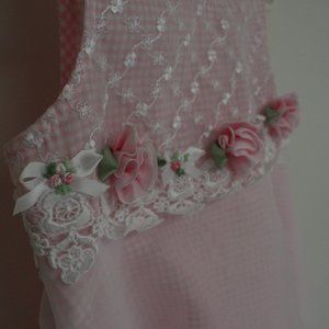 Beautiful Bonnie Jean dress. Light pink Gingham plaid underlying pattern. One picture shows slight stains on this fabric, not visible through the two layers of lightweight fabric that covers this light pink plaid fabric. Fabric is tiered at the bottom.