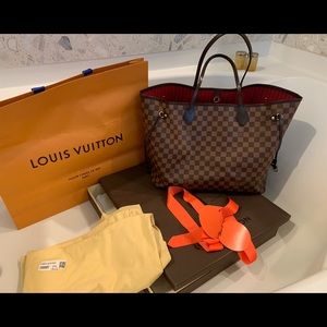 Authentic: Never use wristlet is crafted of signature Louis Vuttion Damier coated canvas. Beautiful Hardware - red striped fabric interior w/patch pocket.