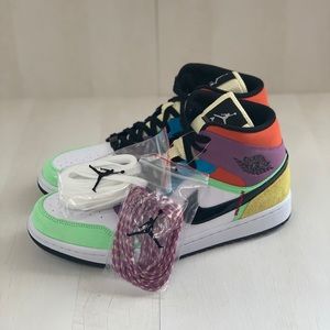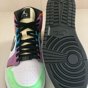 Brand new Jordan 1 Mid Multi color. Crazy color way! Awesome sneaker! Sneakers come with the original box. Women’s size 11.5= men’s size 10.