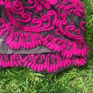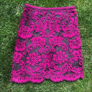 RARE Anthropologie Yoana Baraschi fuchsia pencil skirt with pink/purple floral embroidered details on navy mesh, flattering fitted silhouette, hidden side zipper, navy lining & scalloped hemline. Very small snag in embroidery along waistline (it truthfully isn’t even noticeable while you’re wearing it) otherwise it’s in near-perfect condition! Offers welcome!