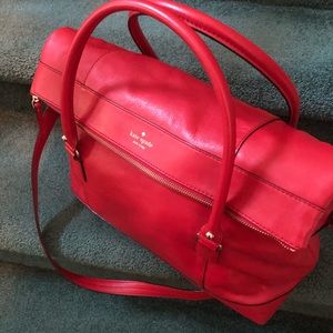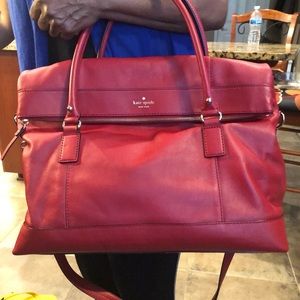 Red leather Kate Spade NY Fremont Place Travel Carmen Bag. Has gold tone hardware, logo at front, dual rolled handles, detachable shoulder strap, red lining throughout inside, single zip compartment at front flap, three pockets at interior walls and magnetic closure at front flap!!!