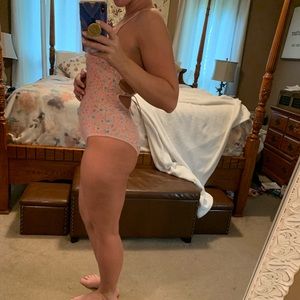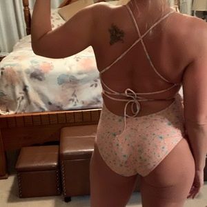 Dainty peach swimsuit with blue & purple floral swimsuit. Super feminine & cute. Previously loved. In great condition, only worn 2 times. Little gold accent at front. I am 5’6” & 162 lbs & wear size 8 jeans & a B cup for reference.