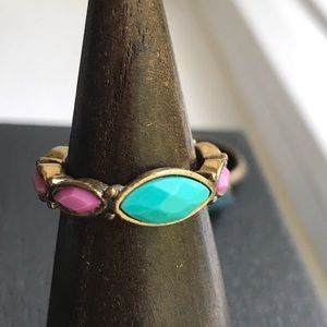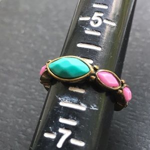 Vintage Lucky rings in graduated sizes from 5.5-6. Beachy blue with a sculpted brass band. Pretty peach stone with twisted rope band. Turquoise with purple stones. (One missing in the bottom. See pic 9)