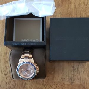 Brand new in case with original packaging. Quartz movement. 45mm Diameter of box. ROSE GOLD with blue and white crystals.