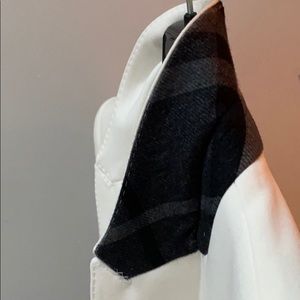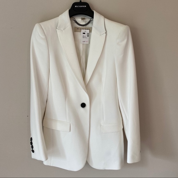 Authentic Burberry London ivory coloured suit jacket in size 4. New with tags purchased from Holt Renfrew Vancouver including black garment bag. Beautiful stitch detailing and back design. I just discovered under the collar Burberry tartan!