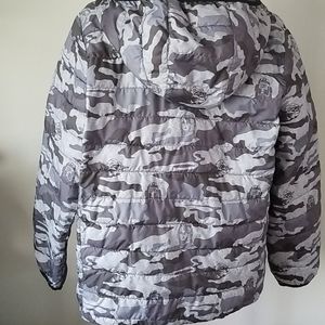 EUC Boys "Star Wars" theme Camo Puffer Hoodie Jacket in dark gray. Quilted and lined with 2 inner pockets. Front zipper with 2 side pockets with snap closures. In excellent condition, no tears or stains. Limited edition pattern and color. No longer fits.