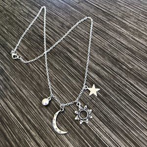 Multi-charms: iridescent jewel charm, sun, jeweled crescent moon charm and a star on an 18" beautiful silver colored chain, nickel free.