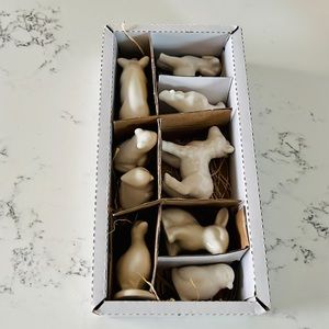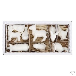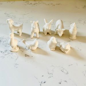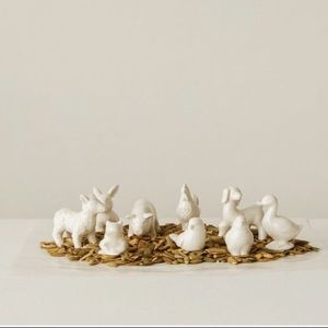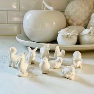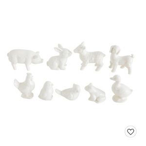 Creative Co-Op White Stoneware Barnyard Animals Set of 9. These figurines can be placed sporadically around shelves for added décor. Place each one on a different windowsill throughout the house for unity throughout the home. If there is an arrangement of candles on the mantel, place these between each candle. Made with stoneware. Includes a pig, rabbit, sheep, dog, hen, chicken, bird, frog, duck. Excellent conditions. Brand new with tag