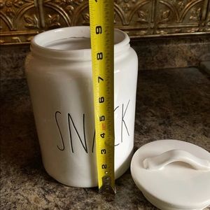 Rae Dunn snack canister shown in pictures. Please note there is a chip on the top inside shown in pictures.