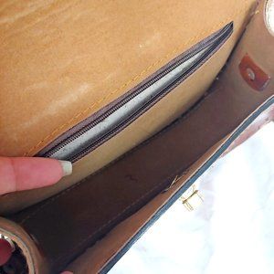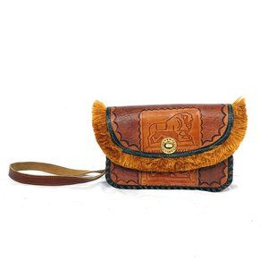 Hand tooled leather brown crossbody bag w/ fringe