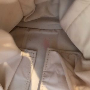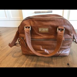 Gorgeous camel leather diaper bag. The leather is super soft. Only used a handful of times great shape but has Some wear on the bottom corners (see pics) and small pink stain on inside (see pics) the bottom metal coverings came off but the retailer sent me some new ones that I will send with the bag (see pics). Awesome bag with lots of storage. You will love this bag and get tons of compliments on it. Smoke free pet free home