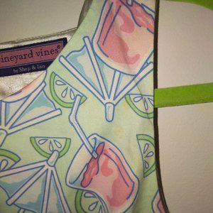 VGUC/GUC size 2 dress. Light green, with pink drinks, blue umbrellas, and green limes. Small spots on left shoulder and left bottom of dress. Almost 17" bust and 33" length from shoulder to hem. Pet and smoke free. Have a size 2 vv skirt listed as well, I will bundle.