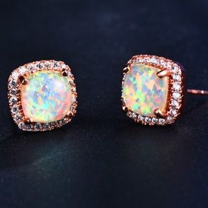 NEW 💎 18kt Rose Gold Fire Opal Halo Stud Earrings