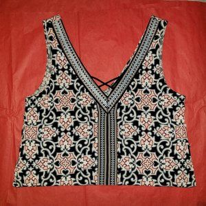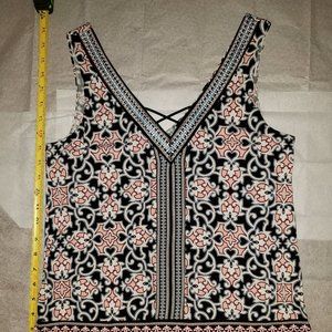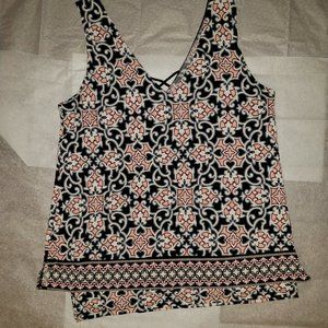 Stylish White House Black Market tank top. Very versatile top. Can be worn with jeans, shorts, dress pants, or skirts. Paisley print one piece with a layering look. Navy blue with red and pink. Very good condition.THRED UP