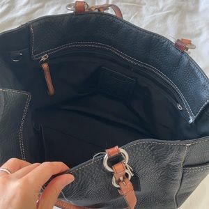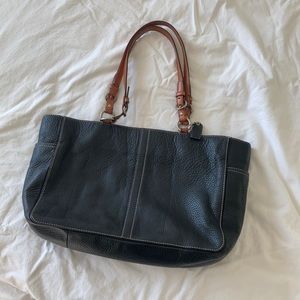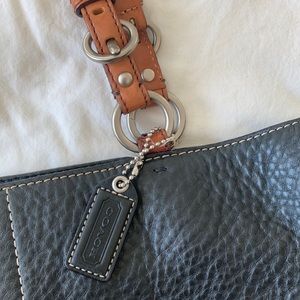 A genuine Coach Shoulder bag. All black leather with saddle color straps. In a great condition. This bag is very spacious to put all your essentials. There are two side outer compartment pockets for easy access to put your phone, keys, or any other small items. There is an inner zipper to keep your belongings secure and has three inner pockets.