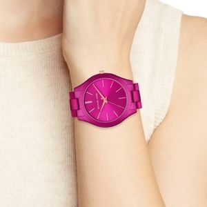 An iconic design in a hot color, this Runway Slim watch from Michael Kors is pure electric pink stainless steel with choice rose gold-tone accents. Style #MK4414