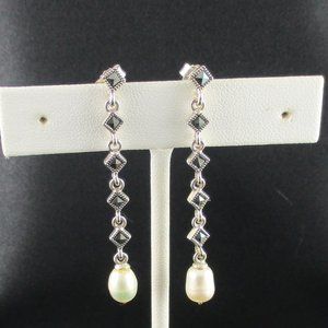 Marcasite & Pearl Sterling Silver Earrings *Measure 2" Long *Stamped .925