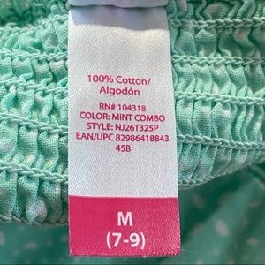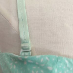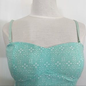 NO BOUNDARIES cotton print removable/adjustable strap sundress. Bra cups, fitted front bodice, elastic smocked back. Size M. Mint and white. There is a small mark on the back skirt towards the bottom. (See pic.). It looks like it would come out if treated.
