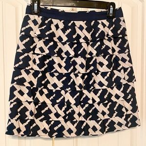 This skirt is adorable and a very flattering fit. Tiered navy blue and cream mini skirt hits about mid thigh (I’m 5’6” for reference). Excellent condition. Back zipper closure.