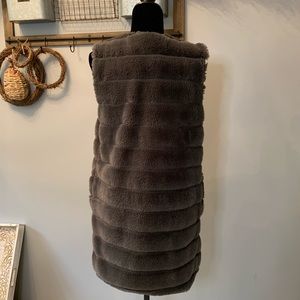 Long Faux fur vest is very cozy, is about 35 inches top to bottom. This vest has pockets and has been very gently used.