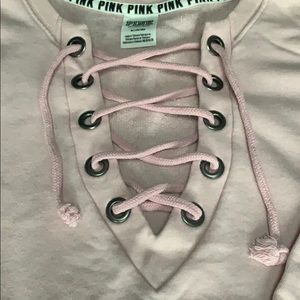 Excellent condition pink by Victoria’s Secret pull over with a lace up detailing around the neck. In a soft pink/light pink/blush color there’s a small white dog logo at the bottom left. Size medium.