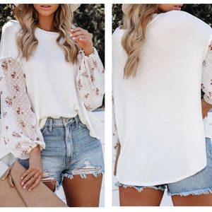 Features: Boho Blossom Contrast Swiss Dot Knit Top; loose fit sold silhouette; printed chiffon patchwork sleeves; stylish comfy style for most occasions; perfect to match with shorts, pants and jeans