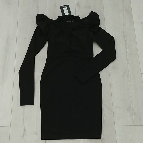 Black Frill Shoulder Mesh Insert Long Sleeve Bodycon Dress