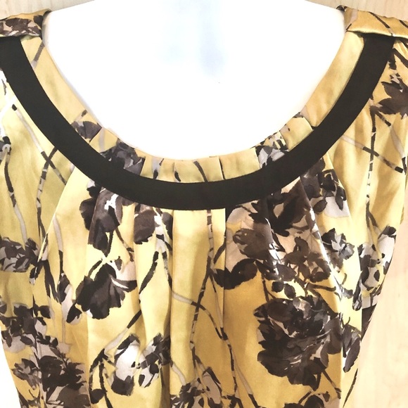This very detailed Anne Klein top has a satin finish to it with beautiful black and gray flowers printed on a dark celery background. the neckline and the details around it are quite interesting and unique