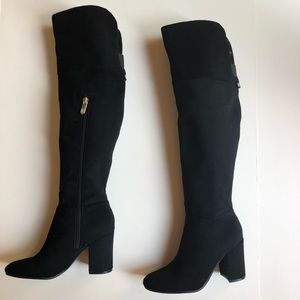 Tommy Hilfiger Neela2 faux suede over the knee riding boots. Sleek, soft, and sophisticated boots! Size 7.5M. They have a zipper opening on the side. Made from textile upper. These were only worn a few times. Overall, they are in great condition. The original shoe box is included. There are two spots on the boots as shown in the photos. Measurements are approximate and included in the photos.