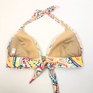 Victoria’s Secret Halter Bikini Top With removable padded cups for lift and support. Excellent condition. This bikini top by Victoria’s Secret has a multi-colored geometric dot floral pattern that will go with so many bikini bottom options. Size medium.