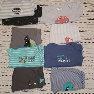 4 sets of pants with onesie. All in good conditions. One shirt has a small stain as shown in picture #6. These are from 6m to 9m. Great for lounging at home. Lot is worth $40.