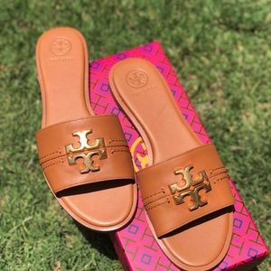 Tory Burch Everly Calf Leather Gold Signature Logo Slide