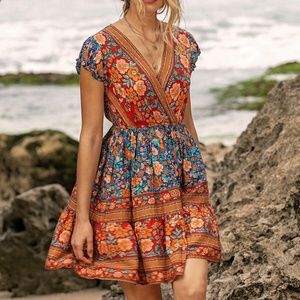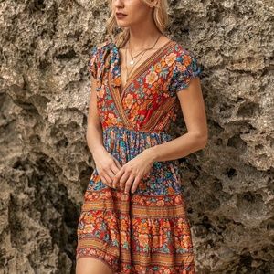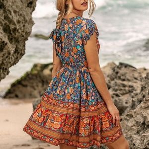 Boho Chic Floral Print V-neck Ruffle Hem Dress