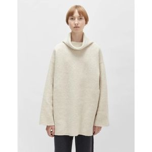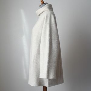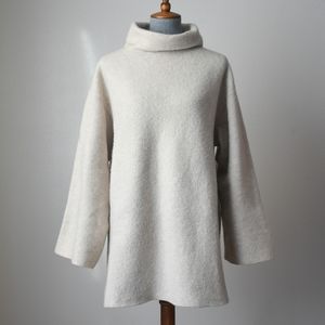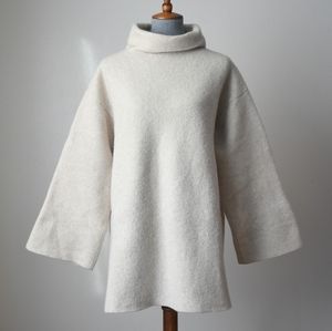 Gorgeous cream oversized funnel neck sweater with wide sleeves knit from a cashmere blend. Oversized fit. Drop shoulders. Tightly woven & felted as opposed to the looser knits. This one doesn't shed all over and is pure magic.