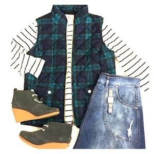 Love this but it no longer fits me correctly so I’m passing it along. Loved but great used shape without any noticeable flaws found to note so there shouldn’t be anything obvious wrong with this item. Comes from a SF home. Lovely plaid that’s perfect for layering & pattern mixing. Lightweight so nice for an extra layer without too much bulk. Four usable front pockets. 2 snap & 2 regular. Gold hard wear. Elastic at back waist area. C all pics 4 details b4 purchase. Note: last pic is stock! Ty!