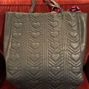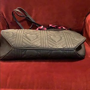 Betsy Johnson black quilted outside with hot pink suede inside and scarf with hot pink kisses. Holds a lot. 16” x 13.5” x 5.25.” Inside is divided into three open sections. Middle has snap closure. Super cute. Very good preloved condition. Straps are perfect. Only signs of wear are on bottom corners. See pictures! Check out my other items and FREE JEWELRY OFFER!