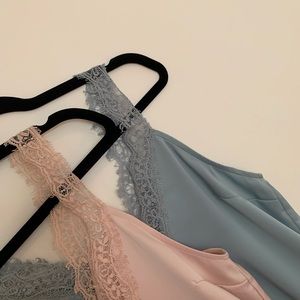 This is stunning on! Made with a durable, thicker fabric that is non sheer. Lace strap detailing. I wore gel stickers to model, but you can wear a bandeau style bra as well. Love these tanks under knitted cardigans 😍
