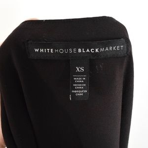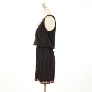 Easy to wear, comfy summer dress from White House Black Market. Super soft & lightweight rayon challis fabric; unlined. Black, with a beige and pink embroidered pattern and the neckline and hemline. Sleeveless, with a V-neckline. Blouson fit with elastic at the waistline. Bodice is unfitted. Hits above the knee. Size XS.