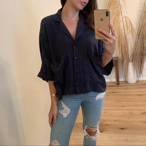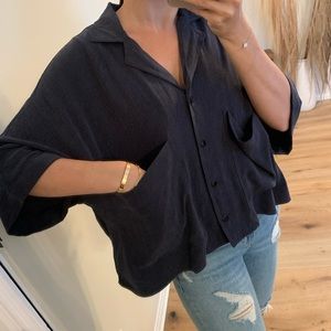 So chic!!! Very high quality fabric, beautiful texture with a versatile style. Can be dressed up or down easily. Loveeee ๐ Boxy wide fit that drapes off all body types, short sleeved, collar with button up closure. Two large front pockets. I TRULY recommend this ๐