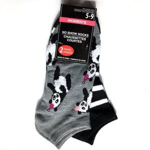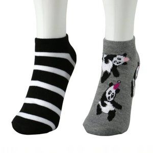 One pair of gray socks with fuzzy panda bears with pink and purple party hats. Plus one pair of black and white striped socks. Fits shoe sizes 5-9. Please see photos for details. New with tags!