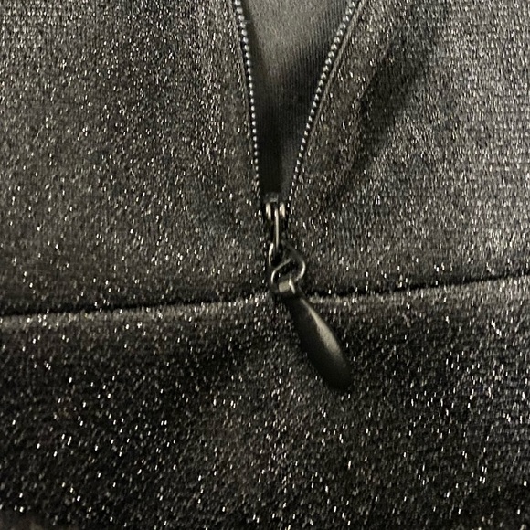 This sparky black mini dress with statement sleeves will be sure to turn heads at your next event. The dress zips up in the back and has a wrap stye tie in the front. The zippers are all in tact with no damage. This dress has only been worn twice. Get this deal while it lasts!