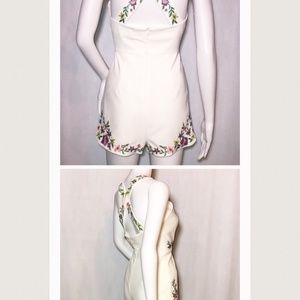 Beautiful, brand new w tags white and floral romper shorts one piece . Never been worn it was an accidental purchase . I bought 2 instead of one. It’s a reposted item but like I said it was accidental. It looks amazing one w; heels for those pretty legs. Still has tags, very filtering . Zips up in back. Crisscross back and floral throughout the entire piece