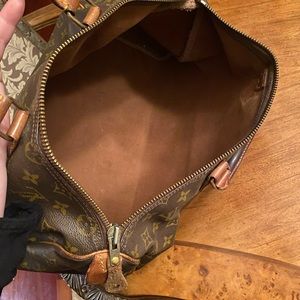 Vintage LV speedy 35. This is made in the early 80’s prior to date codes. Made in Paris, France (on lock and flaps). Classic monogram canvas. Patina has darkened and the leather has some scratches. Small tear under both LV flaps on sides. Piping on corners in good condition. Tiny tear by zipper. Zipper works and in great shape. Slight storage smell. Includes the lock but no key. 13.8” L x 9.1” H x 7.1” W. Ask any questions you may have :) I am also open to offers